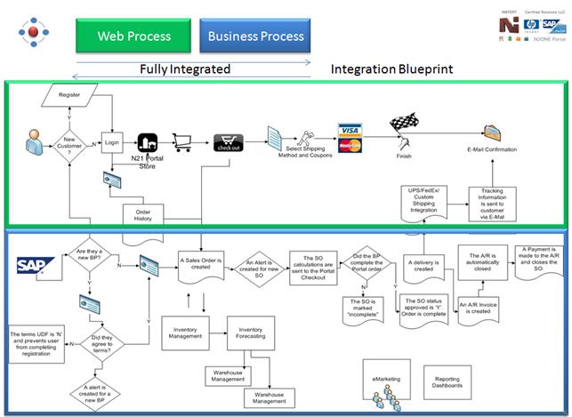 Unter N2ONE Portal wird das Erstellen und die Integration von eCommerce-Geschäften spielerisch einfach. Die Integration mit den SAP Geschäftsprozessen ist dabei mit integriert. Alle webbasierten Anfragen und Bestellungen sind in Echtzeit im SAP System verfügbar. Der Checkout-Prozess beinhaltet Kreditkarten-Validierung und Versandkosten-Optionen. Die aufwändige und fehleranfällige Synchronisation von eCommerce mit Business Daten entfällt. Im SAP System werden dann die relevanten Abteilungen durch einen Business Alert benachrichtigt. Die weitere Bearbeitung der Bestellungen kann dann im System via Audit Trail nachverfolgt werden. Hierdurch erhalten Ihre Geschäftsprozesse Transparenz. Sie erhalten klare Informationen, die zu besseren Planungs- und Geschäftsentscheidungen führen.